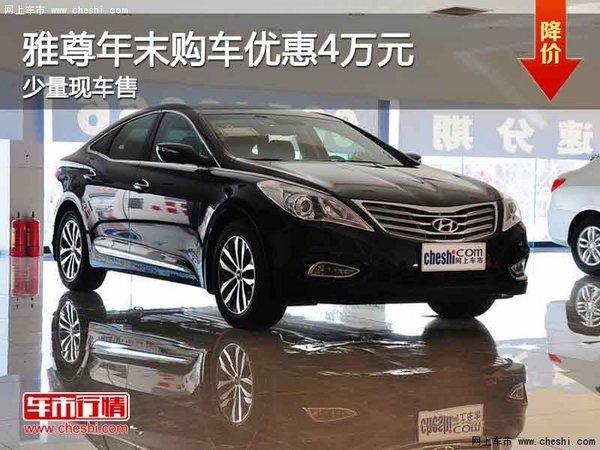 近日,编辑从重庆地区现代经销商处获悉,2014年12月11日-2014年12月18日,雅尊有少量现车在售,购车优惠4.0万元,对这款车感兴趣的朋友们不妨进一步关注一下。具体价格请详见下表: