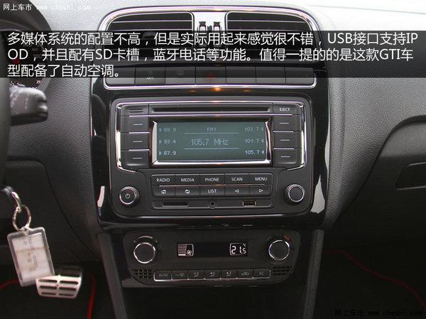 整车的内饰风格依旧很“大众”,采用了全黑设计,但是由于车身尺寸较小,感觉略微有些压抑,而且内饰并没有采用软质材料,方向盘的手感非常不错,能达到GTI级别车型应有的水准,转向回馈感觉很好,并且配有换挡拨片,唯一的缺点就是没有配备多功能按键。仪表采用的是更高级别车型使用的仪表,行车电脑显示的信息更加丰富,280KM/H的表底看起来更有信心。多媒体系统实际用起来感觉很不错,USB接口支持IPOD,并且配有SD卡槽,蓝牙电话等功能。值得一提的的是这款GTI车型配备了自动空调。
