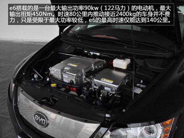 e6搭载的是一台最大输出功率90kw(122马力)的电动机,最大输出扭矩450Nm。时速80公里内推动接近2400kg的车身并不费力,只是受限于 最大功率较低,e6的最高时速仅能达到140公里。可以看到,e6的底盘有整片的钢板做保护,一般情况下的轻微刮蹭不会伤及重要的电池组,但凡事都有例 外,路况不好得时候驾驶员还需加倍小心。