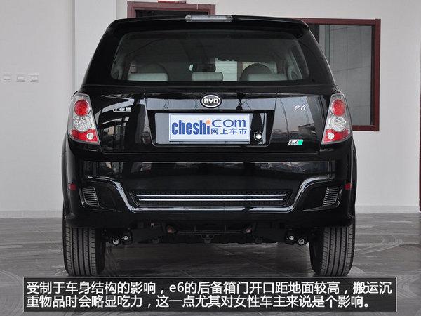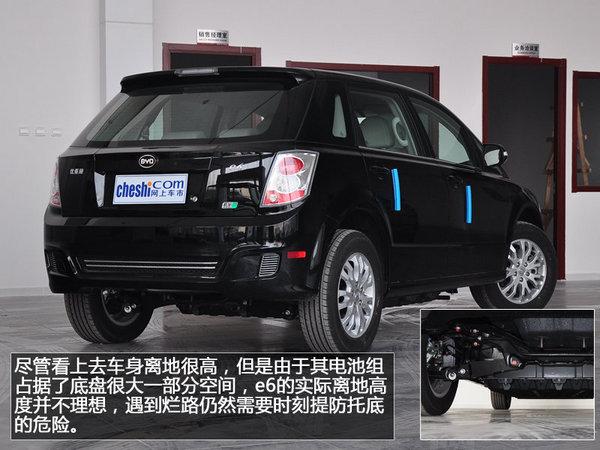 受制于车身结构的影响,e6的后备箱门开口距地面较高,搬运沉重物品时会略显吃力,这一点尤其对女性车主来说是个影响。尽管看上去车身离地很高,但是由于其电池组占据了底盘很大一部分空间,e6的实际离地高度并不理想,遇到烂路仍然需要时刻提防托底的危险。