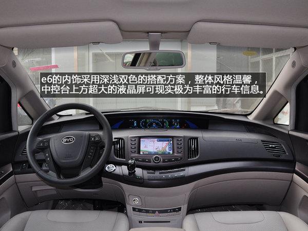 e6的内饰采用深浅双色的搭配方案,整体风格温馨,中控台上方超大的液晶屏可现实极为丰富的行车信息。方向盘为真皮材质,尺寸适中,握感良好。两侧功能区按键大小合适并且文字注释全部为中文,方便驾驶员准确找到所需按钮。