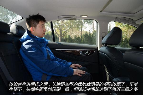前文我们已经提到,加长后的Q50L轴距已经达到了2890mm,虽然不敌宝马3系长轴车型,但与同级别其他品牌车型相比,已经算是佼佼者了。在实际体验过程中,东风英菲尼迪Q50L的表现也没有辜负我们的期望,身高1米70的体验者坐进前排之后,头部空间大概为一拳两指左右,而体验者坐进后排之后,长轴距车型的优势就明显的得到体现了,正常坐姿下,头部空间虽然仅剩一拳,但腿部空间却达到了将近三拳之多。