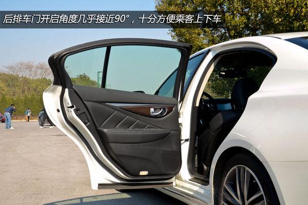 不过由后轮传动的行驶,英菲尼迪Q系列后排中央鼓包的尺寸还是比较大的,所以非特殊情况下,并不建议后排同时乘坐3人,除此之外,在实际使用过程中我们发现,东风英菲尼迪Q50L的后排车门最大角度可开启至90度,乘客上下车十分便利。