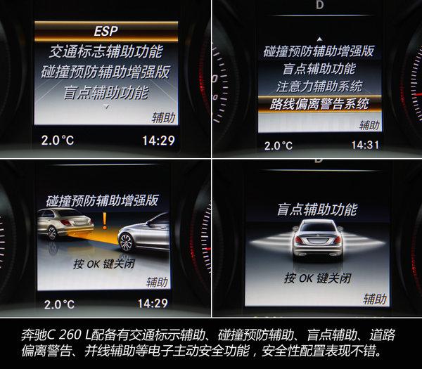 安全性配置方面,全新奔驰C 260 L配备有交通标示辅助、碰撞预防辅助、盲点辅助、道路偏离警告、并线辅助等电子主动安全功能。根据功能不同,辅助系统各自拥有不同的警示方式,配合中央屏幕表达更具象化,更容易被驾驶者发现跟识别。