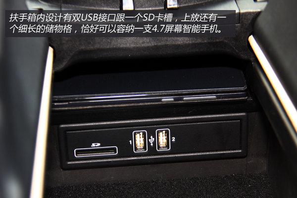 储物空间方面前排扶手箱内容积十分可观,内有绒布内衬,双USB接口、SD卡卡槽以及细部储物格都让这里的功能显得十分丰满。