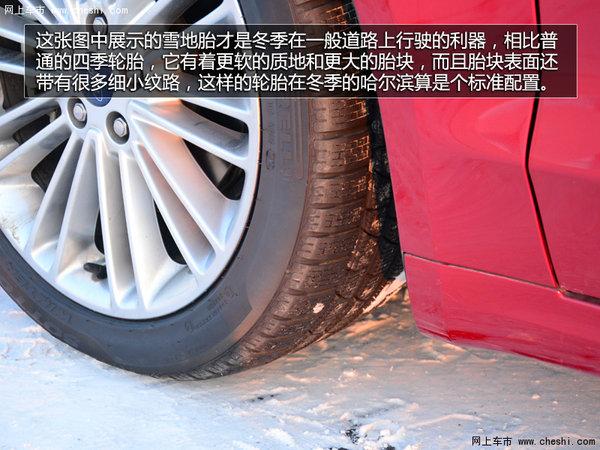 进行场地体验的车辆就是这台长安福特新蒙迪欧,其在干燥路面上出色的操控表现曾给大家留下了深刻的印象,至于其在冰面上的表现如何,大家更是充满了期待。为了配合此次的试驾,车辆更换了带有钢钉的冰面专用轮胎,它能在冰面上最大限度的提升车辆的抓地力,但需要注意的是,这种轮胎是不能在正常道路上行驶的。其实在冬季的哈尔滨更常见的还是雪地胎,相比普通的四季轮胎,它有着更软的质地和更大的胎块,而且胎块表面还带有很多细小纹路。