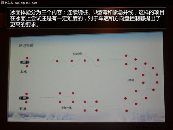 除了专用于冰面的轮胎,蒙迪欧所配备的ESC车身稳定控制系统和TCS牵引力控制系统也是冰面驾驶的安全保障,其中ESC负责修正行车轨迹,而TCS则可在必要时限制发动机动力输出,减少打滑发生的几率。虽然大家都跃跃欲试,但首先还是由包腾锦老师进行试驾演示,演示过程中在场的工作人员对场地进行了进一步的讲解。