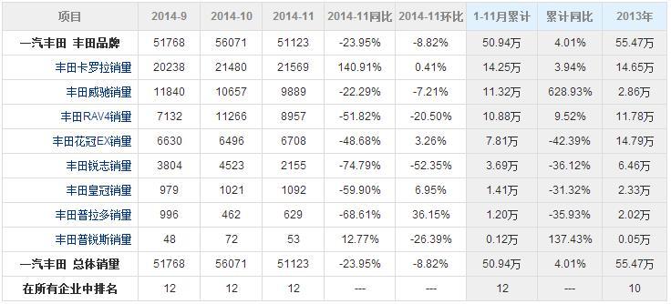 今年9月,一汽丰田宣布将全年销量目标由66万辆调整为62万辆。作为丰田在华销量的主要贡献方,一汽丰田已经连续3年未能达成年初所定目标。据搜狐数据显示,今年11月,一汽丰田实现销售51123辆,同比下降23.95%,环比下降8.82%。1-11月,累计销售50.94万,同比增长4.01%。这也表明,一汽丰田将很有可能连续4年无法达成销量目标。