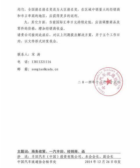 在发送给一汽丰田的致函中,流通协会提到,因一汽丰田商务政策和压库行为等,导致经销商库存超限、价格倒挂,引发资金紧张,经营费用和财务费用大幅增加,经济效益下滑,不少经销商出现严重亏损局面,处于即将倒闭境地。