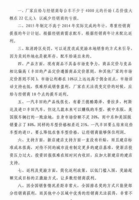 同时,流通协会代表500多家一汽丰田经销商提出九点建议,包括厂家应给经销商每台车不少于4000元的补助(总价值大概在22亿元);厂家2015年制定不高于2014年实际完成的年度计划;取消跨区处罚等等。