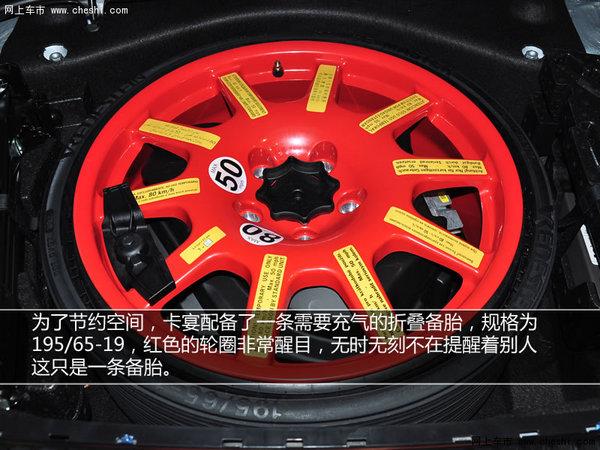 尾箱的地板平整度非常好,后排座椅支持6/4放倒,官方给出的尾箱最大空间为1705升,这样的空间基本上日常能用得到的东西都能放得下。为了节约空间,卡宴配备了一条需要充气的折叠备胎,规格为195/65-19,红色的轮圈非常醒目,无时无刻不在提醒着别人这只是一条备胎。