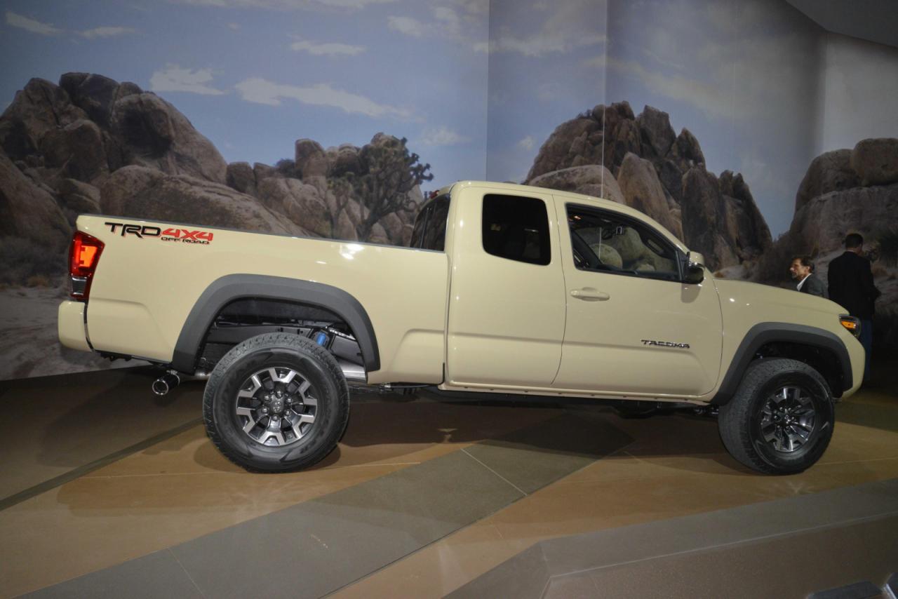 在北美车展上,最大的亮点之一应该就是别的国家都没有的各种皮卡车型的亮相了,现在丰田带来了他们的全新Tacoma车型在底特律展台亮相。丰田新款Tacoma车型将竞争对手锁定为雪佛兰Colorado以及GMC的Canyon两款车型,新款车型在设计上借鉴了一些4Runner的造型设计。