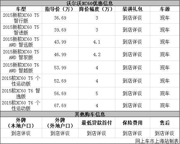 日前网上车市上海站从上海世之沃4s店了解到,目前该店沃尔沃XC60优惠出售,详细请见下表: