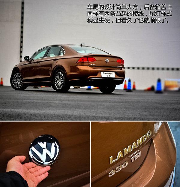 凌渡车尾的造型没有像其他大众车那样采用大量的镀铬装饰条来丰富层次,而是使用了凹凸有致的棱线加以妆点,尾箱开关依旧是大众LOGO,大众CC看上去则要更加圆润,后杠上有一条镀铬装饰。