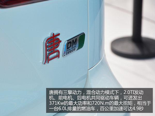 动力方面,比亚迪唐搭载了三擎双模动力系统,其由一台2.0TI涡轮增压发动机和前后两个电机组成,可实现前轮与后轮独立动力输出。在混合动力模式下,三个“引擎”同时发力,可迸发出371Kw的最大功率和720N·m的峰值扭矩。与之匹配的是6速湿式双离合变速箱。比亚迪官方表示,比亚迪唐0-100km/h的加速时间仅需4.9秒。