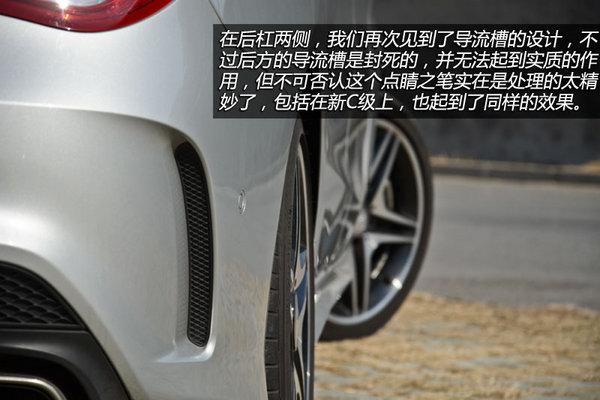 其次就是尾灯,整体造型与CLS虽然有些相似,但线条的设计更加复杂,尤其是在夜间时内部LED光带点亮后简直是太漂亮了,怎么形容呢?如果我正跟在一辆CLA后面的话,那么我很想一直跟着它。在后保险杠两侧,我们再次见到了导流槽的设计,不过后方的导流槽是封死的,并无法起到实质的作用,但不可否认这个点睛之笔实在是处理的太精妙了,包括在新C级上,也起到了同样的效果。