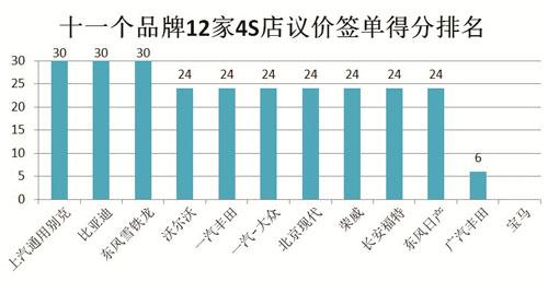 在“议价签单”环节,大多数4S店的得分并没有太大的差别。上汽通用别克、比亚迪及东风雪铁龙更是得到了满分,而有些4S店均由于强制店内投保,存在变相加价售车行为而被扣分。其中,北京现代更是要求新车的装饰需要在本店完成,否则不给提车。