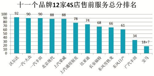 在被调查的12家4S店中,宝马4S店由于在调查人员进入4S店30分钟内无人接待,只能对展厅环境进行测评。宝马能提供怎样的服务,销售顾问又具备怎样的专业素质不得而知。