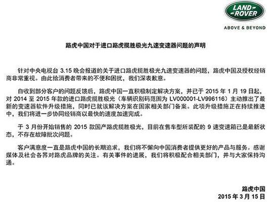 与此前官方迟迟未就极光问题回应相反,在央视3·15晚会播出后,路虎官方就极光变速箱问题公开表态,3月16日凌晨1时28分,中国经济网汽车收到路虎的“声明”。
