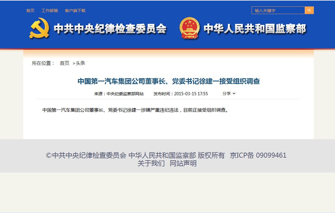 2015年3月15 日,据中共中央纪律检查委员会官方网站消息,中国第一汽车集团公司董事长、党委书记徐建一涉嫌严重违纪违法,目前正接受组织调查。