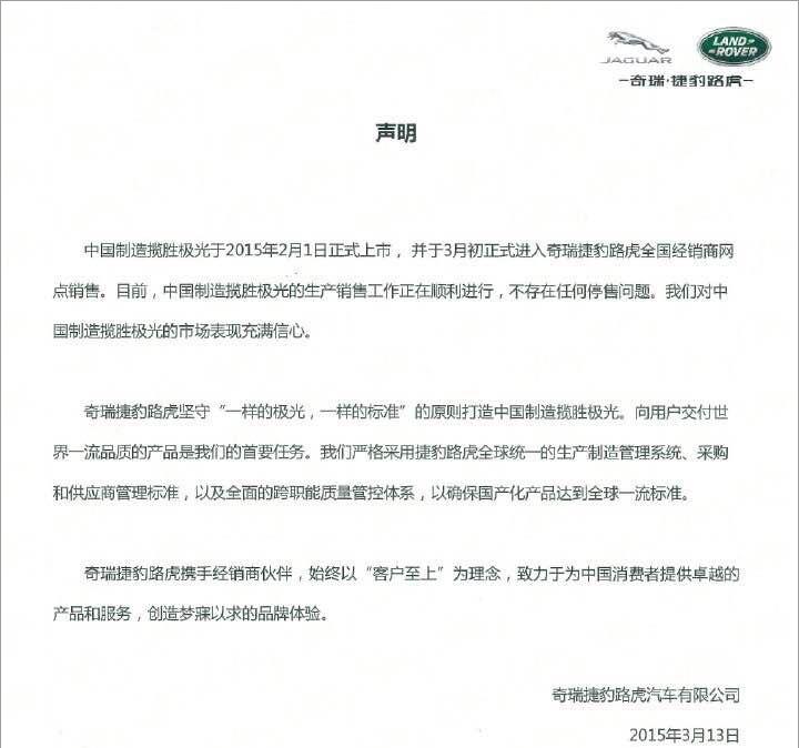 此外,近日还有传闻称“国产路虎极光因配件问题全系暂停销售,甚至可能被召回,路虎经销商已经收到了来自厂家方面的口头通知”。对此,路虎官方发表声明,表示“国产路虎揽胜极光的生产及销售工作正在顺利进行,不存在任何停售的问题”。以下是声明截图: