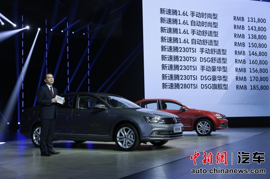 中新网3月24日电 昨晚,一汽-大众宣布新速腾正式上市,发动机升级为EA211系列,提供三种动力共计9款车型。售价区间为13.18-18.58万元。一汽-大众汽车有限公司董事、总经理张丕杰先生公布新速腾上市详细价格:1.6L手动时尚型:131,800元;1.6L自动时尚型:143,800元;1.6L手动舒适型:138,800元;1.6L自动舒适型:150,800元; 230TSI(1.4TSI低功率版) 手动舒适型:146,800元; 230TSI DSG(1.4TSI低功率版)舒适型:160,800元; 230TSI(1.4TSI低功率版)手动豪华型:156,800元; 230TSI DSG(1.4TSI低功率版)豪华型:170,800元; 280TSI DSG旗舰型(1.4TSI高功率版):185,800元