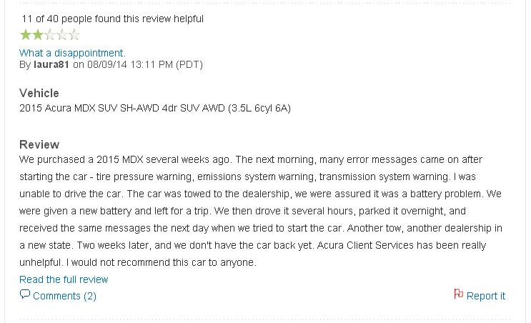 这位北美车主同样在 网站上抱怨自己的MDX车型出现的各种问题。车主购买的是2015款MDX车型,在购买后的第二天早上,启动车辆后很多报错警报开始出现,诸如胎压报警,排放系统报警,变速箱系统报警。车主甚至无法正常驾驶车辆。车辆被拖至经销商处,我们确信是电池出了问题导致整体报警。我们在更换新电池后开了一段路程。当我们驾驶了几个小时后,放置过夜到第二天的时候,同样的问题再次出现,拖车至另外一个州的经销商处进行修理,而这导致两周后我们的车还没有修好。讴歌的客服没有任何帮忙,我甚至不愿跟任何人提及这款车。(记者 韩大为)