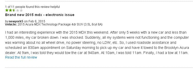 同样是来自北美最的经销商网站车主对于MDX的评论,车主购买的是讴歌MDX选配科技选装包车型。据车主反映在周末开车的过程中发生过一件有趣的事,新车在买回5个星期后,行驶里程低于1000英里,MDX出现了严重的问题,车主感到非常的震惊,所有的车载系统都无法工作了,电脑显示警示并告知我没有四驱系统,助力转向也没有,车道偏离辅助西酮也失灵了,诸如此类的通知。随后我靠边停车后等待救援的到来并且电话预约了布鲁克林区的讴歌经销商,预约上午8点半来徒走是我的车进行检查,而倒了9点的时候他们通知我车子会在9点40被取走,随后到了10点又被告知要11点才能取走,最终是上午11点取走的车。