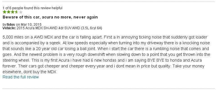 来自北美最大的车主经销商网站车主反馈,车主购买的是新款的讴歌MDX车型,配置为3.5升V6发动机配6AT四驱版车型。车主在购买新车开了5000英里后发现车子的整体品质开始出现问题,首先是在行驶中会突然发出恼人的声音并且找不出何处发声。同时在低速行驶的时候,转向进入我的车道的时候会有隆隆声传来,感觉像是开了20年以上的老车失去了悬挂上的球窝接头一样。在当我启动车辆的过程中也是会有隆隆声发出并消失。最新暴露出来的问题就是在换挡低速行车的时候会有闯档的感觉。这是我第一款讴歌车型,之前我已经购买过6款本田新车,现在我要永远对本田以及讴歌说再见了。这两个品牌的车型价格每年都在降低,我并不在乎价格而是在乎车的品质。把你的钱花在别的什么品牌上吧,但别买MDX了。