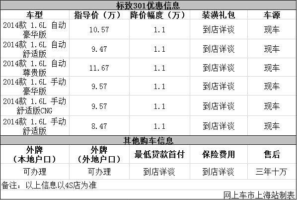日前网上车市上海站从上海冠隆标致4s店了解到,目前该店标致301优惠出售,详细请见下表: