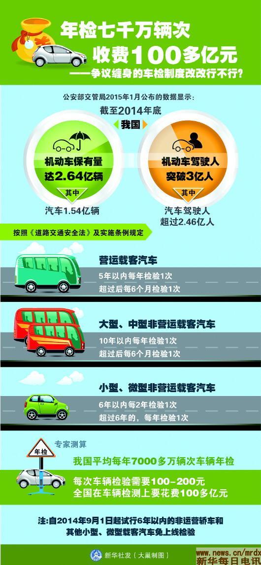 专家测算,我国平均每年7000多万辆次车辆年检,每次车辆检验需要100-200元,全国在车辆检测上要花费100多亿元。