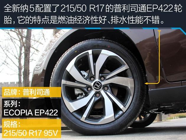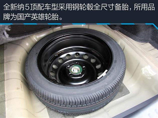 全新纳5采用了粗细结合的十辐式轮毂,造型比较动感。轮胎选用了普利司通品牌,型号为215/50 R17。备胎方面,只有顶配车型配备了全尺寸备胎。