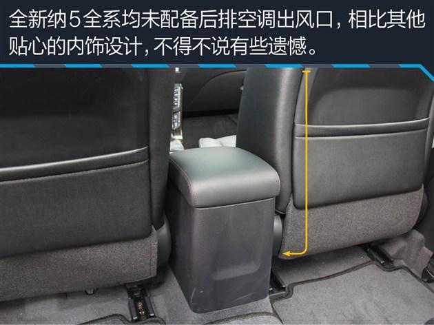 全新纳5内饰在做工以及用料上都体现了不错的水准,同时中控台手机托架、挂钩等一些设计在让人倍感贴心的同时实用性也很强,这些都是国内消费者们所喜闻乐见的。
