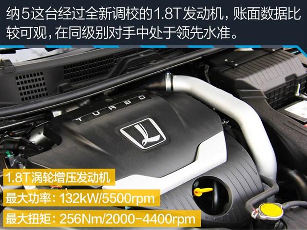 全新纳5所搭载这台1.8T发动机与上一代车型所搭载的1.8T发动机在机械本体上没有什么区别,但是经过重新调校,其账面数据相当抢眼:最大功率132kW/5500rpm,最大扭矩256Nm/2000-4400rpm,基本相当于主流的2.0L自然吸气发动机的参数水平,而与目前主流的涡轮增压发动机阵营来比较,从参数上看其高于大众高尔夫的1.4T发动机,与别克英朗和雪佛兰迈锐宝的1.6T发动机实力接近。