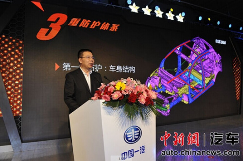 天津一汽产品开发中心常务副主任郑福荣在发布会上解密了骏派D60的防护体系。郑福荣介绍,骏派D60在对乘员保护上拥有三重防护体系:即车身结构防护,通过安全坚固的车身以及左右结构的协调性,精心设计了能量传递路径和吸能区;约束系统防护,包括吸能管柱、预张紧式安全带、6安全气囊等,在发生碰撞时与车身结构形成双重保障;空间设计防护,骏派D60的内部空间也是设计的一大亮点,驾乘人员的腿部、头部预留了足够的空间,配合防侵入制动踏板、可压溃油门踏板、歇脚板处的聚丙烯发泡材料等各种细节设计有效保护驾乘人员安全。