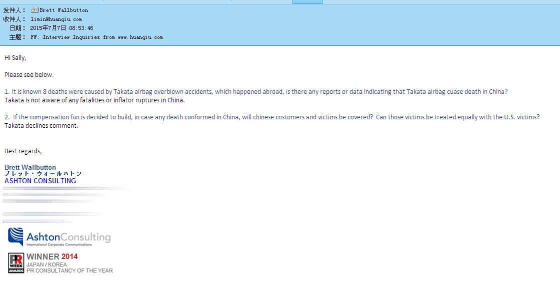 而未来一旦发生中国消费者因为高田气囊问题而遭受的伤害案例,高田是否会考虑启动同美国消费者类似的赔偿计划时( If the compensation fun is decided to build, in case any death conformed in China, will chinese costomers and victims be covered? Can those victims be treated equally with the U.S. victims?),得到了是一句冰冷的标准公关“话术”,“Takata declines comment(高田对于这个问题拒绝置评)”。