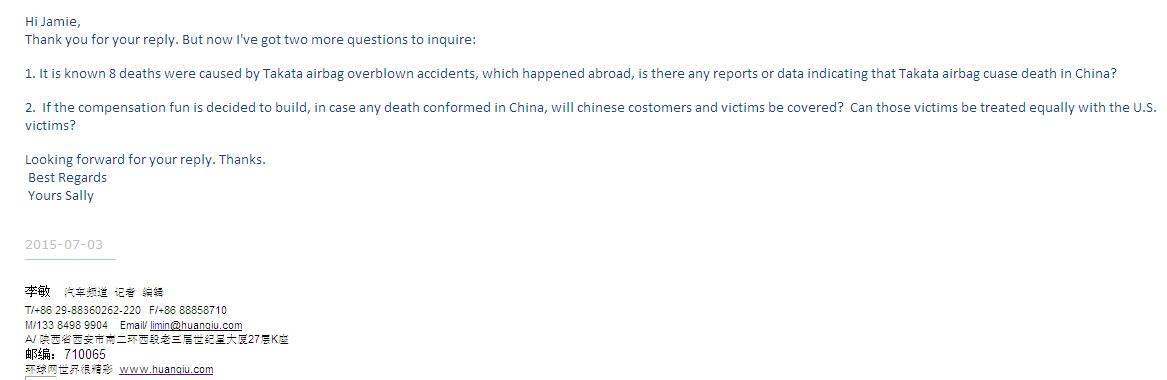 环球网记者第二次邮电质询高田公司