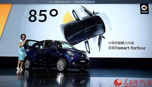 在此次车展上,smart家族迎来了全新四门四座的smart forfour的中国首秀。 smartforfour采用了更加实用的五门设计,其车身长度达到了3500mm。前大灯组融入LED光源,配合全新的家族式进气格栅,使新车看起来更加精致可爱。动力方面,该车将采用与smart fortwo相同的动力配备,搭载一台1.0L三缸发动机和一台0.9T三缸发动机,最大功率分别为71马力和90马力。传动方面,与发动机匹配的将是5速手动变速箱,此外,新车还可选装6速双离合变速箱。