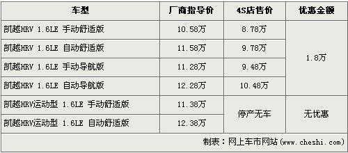 据经销商处销售人员介绍,凯越HRV共有6个车型,由于运动版车型现已停产,经销店内已经没有现车,所以在售的车型只有舒适版和导航版共4款车型。近期购买凯越HRV的消费者可以得到1.8万元的现金优惠,经优惠后,入门级的1.6LE手动舒适版车型售价从厂商指导价10.58万元跌至8.78万元。