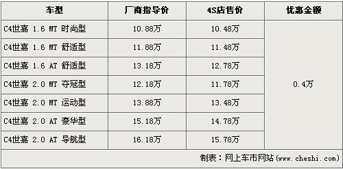 C4世嘉是东风雪铁龙于2008年7月28日发布的去年第二款新车,厂商指导价为10.88万-16.88万元。今年的4月6日,东风雪铁龙又为C4世嘉添加了2.0L手动夺冠版车型,致使C4世嘉车型增加到了7款。近日根据网上车市价格监测系统显示,C4世嘉目前全系优惠4000元,具体车型售价见下表: