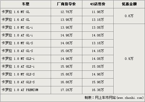 卡罗拉是一汽丰田于旗下的主力经济型轿车,上市后凭借着时尚的外观赢得了消费者的喜爱。卡罗拉全系共有5款车型,排量分为1.6L、1.8L,价格区间为13.28万元-17.98万元。前段时间,丰田官方对卡罗拉全系下调了厂商指导价,最高下降了9000元。近日根据网上车市价格监测系统显示,近期在经销店购买卡罗拉车型的消费者,可以得到最高9000元的优惠,具体详情请看下表: