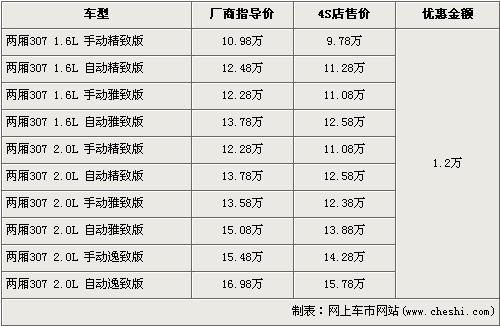 据东风标致经销店销售人员介绍,两厢标致307分为1.6L和2.0L两种排量,目前全系优惠1.2万元,入门车型的1.6L 手动精致版原厂商指导价为10.98万元,经优惠后仅售9.78万元,排量稍大的2.0L排量的低配车型手动精致版经优惠后售价为11.08万元。