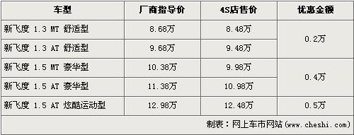新飞度是广州本田去年7月份上市的车型,其是广州本田经济型轿车的主力军,外形比起老款飞度更加前卫更加时尚,创新的动感另类驾驶舱更是一大亮点。近日据网上车市网站价格监测系统显示,新飞度全系最高优惠金额为5000元,具体详情请看下表: