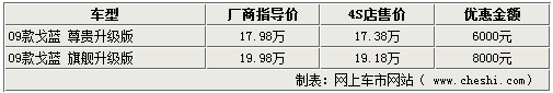 09款戈蓝升级版主要是在原有车型的基础上,对配备及价格进行优化,尊贵升级版较原有车型新增折叠钥匙和定速巡航等配备,旗舰升级版较原有车型,取消了方向盘切换档功能,增加了折叠钥匙、定速巡航、副驾座电动调节功能、胎压侦测系统以及采用10辐动感铝圈等配置。另外,旗舰运动版更将原有8喇叭音响升级为12音路金属振膜立体声音响,为用户营造更丰富的影音体验。(郝俊)