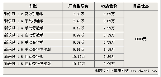 据4S店销售人员介绍:目前雪佛兰新乐风全系优惠达8000元,较之前优惠幅度持平。1.2车型目前无现车,预订需等1-3周左右。由于1.2升较小的排量与新乐风略大的车身配比并不十分完美,所以选择1.4升排量车型消费者较多,同时现车也非常充足,颜色较齐全。1.6升车型目前现车较少,颜色也不够齐全,银色车型较多,预定需等待1-2周时间。