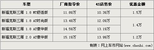 据4S店销售人员介绍:目前福克斯三厢1.8升三款车型现车充足,尤其银色、灰色、蓝色、黑色车型现车较多,手动挡车型目前优惠1.5万元,优惠后仅售10.39万元,1.8升自动版车型优惠1.4万元。2.0升车型目前现车较少,颜色也不齐全,订车需等待3周左右,目前优惠1.2万元。