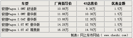 据销售人员介绍,虽然两款增压版骏捷Wagon车型经官方调价,但各店内销售的骏捷WAGON车型仍可给出1.5万元的现金优惠,还是相当超值的。现阶段店内在售的主要为1.8L的手动版车型,而2.0L车型较少,如需购买仍需提前预订,订金为5000元,一个月左右的时间即可提车。