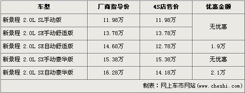 根据北京雪佛兰4S店销售人员介绍,由于2010款新景程将要上市,所以在款的景程已经停产,并且店内已没有手动挡现车,自动档现车数量有限。经1.9万元优惠后,2.0L自动舒适版的售价降到了12.78万元,2.0L自动豪华版经2.1万元优惠后售价也降到了14.18万元。