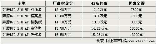 据一汽奔腾汽车4S店销售人员介绍,目前09款奔腾B70现车颜色不全,主要以银色车型为主,目前手动挡车型只能优惠7800元;上市不久的自动特装版能够优惠8800元;而另外两款自动挡车型现在能够优惠到13000元,如果到店详谈还能有更多的优惠政策。2010款奔腾于九月十六日正式推出,售价在12.98万至18.88万元之间。