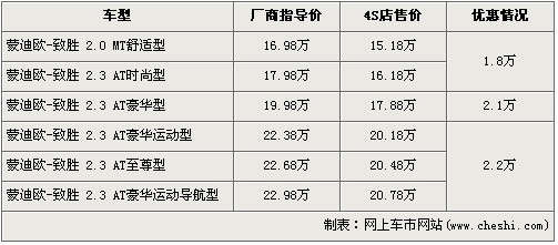 据4S店销售人员介绍:在售的蒙迪欧-致胜共有6款车型,近期购买的消费者最高可以得到2.2万元的优惠。入门级的2.0L手动舒适版以及2.3L自动时尚版经1.8万元的优惠后,售价分别降为了15.18万元和16.18万元,2.3L自动豪华版经2.1万元优惠后,售价降到了2.1万元。2.3L豪华运动版、至尊版以及豪华运动导航版经全系最高的2.2万元优惠后,售价分别降为了20.18万、20.48万以及20.78万元。